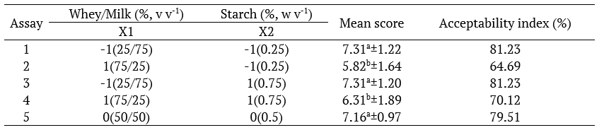 In order to study the effect of whey/milk ratio(v v-1) and the starch content to be added to the dairy beverage formulation, a 22 factorial design was developed, varying the whey/milk ratio and the starch (Table 1), and fixing the concentration of sugar at 5 (w v-1), coffee at 0.75 (w v-1) and mint extract at (0.025% (w v-1), based on previous tests.