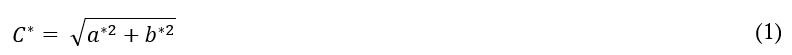 For color determination, the portable colorimeter equipment (Minolta CR400) was used in the L*, a*, and b* scales. To verify the color difference among the dairy beverage samples, parameters a* and b* were presented in a color chart in terms of chromaticity (C*) calculated by Equation 1, and color angle °hour calculated by Equation 2, whereas parameter L*, which indicates luminosity was treated statistically (Machado, Hotza, Petter, & Bergmann, 1997; Rodrigues, Souza, Lima, Moura, & Geraldine, 2013).