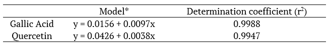 The moisture of the M. x piperita sample used was 8.9% as determined by infra-red. Table 2 presents the models and determination coefficients of gallic acid and quercetin standard curves used to determine the total phenolic and flavonoid contents. The standard curves presented satisfactory determination coefficients. Table 3 presents the extraction yield, the phenolic and flavonoid compounds content, flavonoids and the antioxidant activity of M. x piperita extracts on the different solvents concentrations.