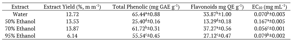 For total phenolic content, the Tukey test indicated a significant difference (p < 0.05) for all solvent concentrations used. The aqueous extract had the highest 65.44 mg GAE g-1 extract content, followed by 70, 95, and 50% ethanol with 61.72, 55.54, and 25.40 mg GAE g-1 extract contents, respectively. The phenolic compounds extraction tended to increase with the reduction of ethanol concentration, except for 50% ethanol.