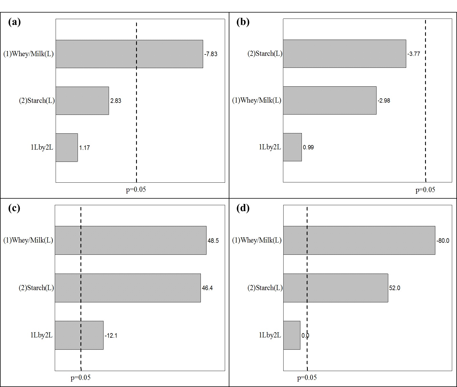 Figure 1b presents the Pareto Chart for the dairy beverage acidity, where the two studied variables did not present any significant effect (p > 0.05) within the studied range. The Whey/Milk content variation and the starch content did not influence the acidity of the samples. The lactic acid content may function as an indicator of the raw materials and dairy products quality and either microbial activities or enzymatic reactions might cause acidity increase (Islam, Sarker, Prabakusuma, Russel, & Islam, 2018).