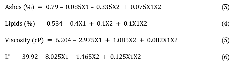 The results for ash and lipids contents, viscosity, and luminosity were statistically treated by the analysis of variance and the non-significant effects (p > 0.05) were added to the lack of adjustment as seen in Table 4. Equation 3, 4, 5, and 6 present first order coded models for ashes, lipid, viscosity, and luminosity (L*) of the dairy beverage values, respectively. The models were validated by analysis of variance (ANOVA) obtaining correlation coefficients of 0.91, 0.94, 0.99, and 0.94 and the calculated F values (10.36, 15.29, 165.33 and 15.33) were higher than the tabulated F (9.28) value, which allowed the contour curves construction shown in Figure 2.