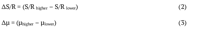 Once the S/N ratio values for each factor and level have been calculated, it is necessary to calculate the mean effects for the S/R ratio and for the means of each factor. The variation of the factors for the S/R ratio and for the means is calculated by the interval Δ (Delta) defined by Equation 2 and 3, and then ranked from the highest to the lowest value as Gomes, Paiva, Costa, Balestrassi, and Paiva (2013).