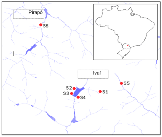 The present study was conducted in six different aquatic regions of two rivers in the catchment area of Apucarana City (Paraná State, Brazil) during October-November 2014 and February-March 2015. These rivers (Pirapó and Ivaí) are among the primary sources of drinking water in the city.
