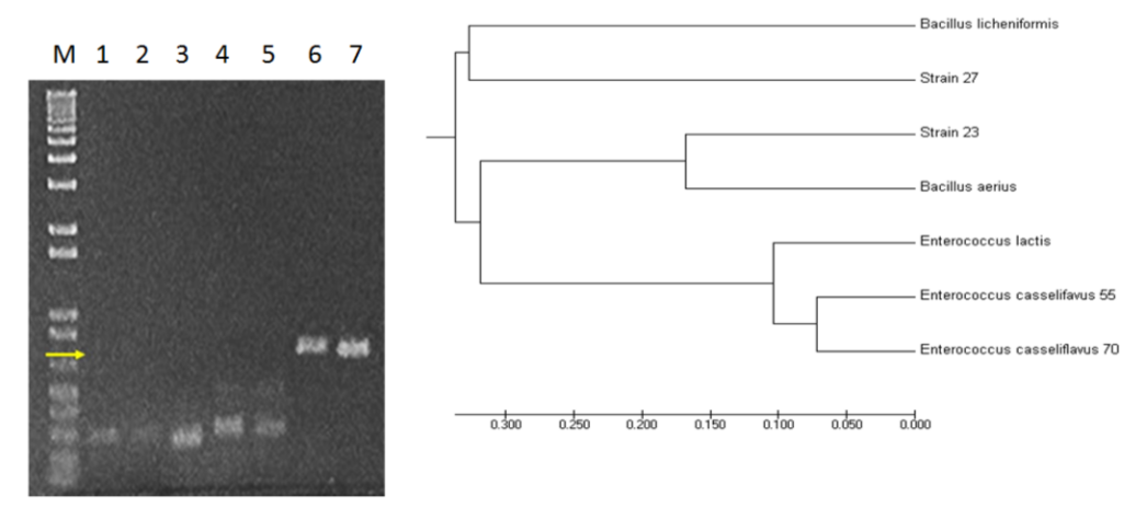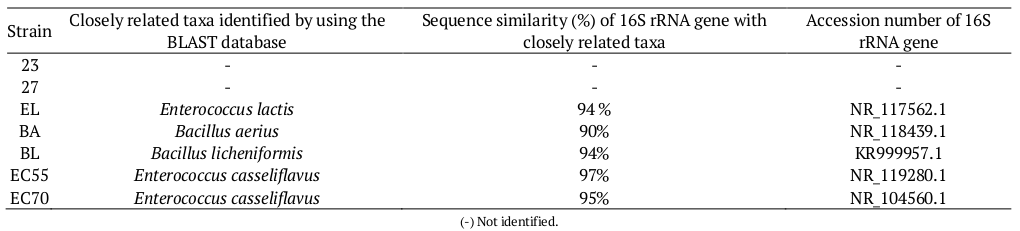 Bacterial strains were identified taxonomically by 16S rDNA gene sequencing (Table 1). Comparing these 16S rDNA sequences to those in NCBI/GenBank, the isolated strains were found to belong to the genera Enterococcus and Bacillus, sharing more than 90% similarity to their closest relatives. The sequences of strains 23 and 27 did not align with any microorganisms deposited in the DNA database.