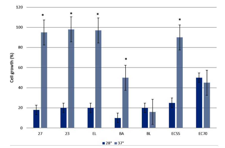 The cell growth of the seven evaluated isolates differed considerably in relation to the incubation temperature; strains 23, 27, EL, and EC55 presented almost 100% growth at 37°C; already at the incubation temperature at 28°C, the best results were presented by the isolates B. licheniformis BL and E. casseliflavus EC70, although these isolates did not show significant growth in this copper concentration (Figure 3). For the other isolates, the temperature of 37°C showed the best bacterial growth.