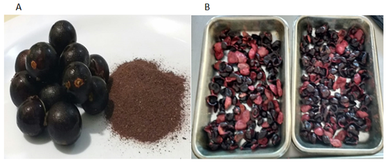 The pulp was removed manually, and the peel was placed on metal trays and dehydrated at 50ºC with ventilation for 22h in an electric oven (G. Paniz FTE 120), as performed by Santiago et al. (2018). Then, the dried jaboticaba reached a final moisture content of 6.23 ± 0.38% and was grounded in a knife grinder (Marconi MA 680, Brazil) followed by a second grind in a household mill (Philips Walita RI7761, Brazil). Jaboticaba fruits, peel, and flour produced are demonstrated in Figure 1.