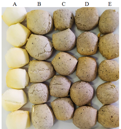 The JPF obtained presented moisture content of 6.23 ± 0.2%, pH equal to 6.2 ± 0.4, total acidity of 1.55 ± 0.05 g of citric acid 100 g-1 and color corresponded to L* 27.54 ± 1.66, a* 12.18 ± 0.26 and b* 8.61± 0.24. When added to biscuit formulations, it was found that the main influence of JPF was on the luminosity (L*), and the higher the addition, the lower the luminosity (p < 0.05) of biscuits, as it can be seen in Figure 2.Bender et al. (2016) point out that the dark coloring of an ingredient can limit its use in food products. On the other hand, it can be associated by consumers with whole ingredients and, therefore, healthier.