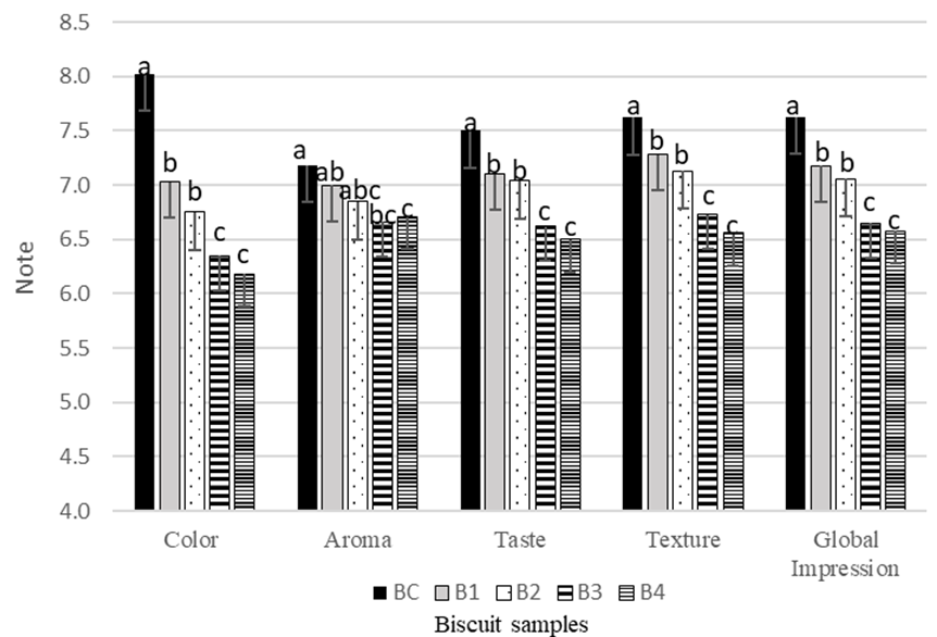 Through the hedonic scale, it was verified that all attributes evaluated (color, flavor, aroma, texture, and overall impression) differed among the five biscuit formulations analyzed (p < 0.05). The control formulation had the highest score for all attributes except for aroma, which did not differ among BC, B1, and B2. The global impression for B1, B2, B3, and B4 ranged from approximately 6.5 to 7.5, confirming that the acceptance of sequilho biscuits at concentrations up to 5% is adequate.