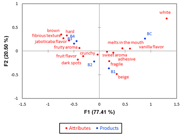 Regarding the aroma, it was found that all formulations added of JPF were associated with the term "fruity aroma", differing from BC, which was less associated with such term. Regarding flavor, all biscuit added with JPF had higher associations with the terms "fruit flavor", differing (p < 0.05) from BC. Formulations B3 and B4 were more associated with the term "jaboticaba flavor".