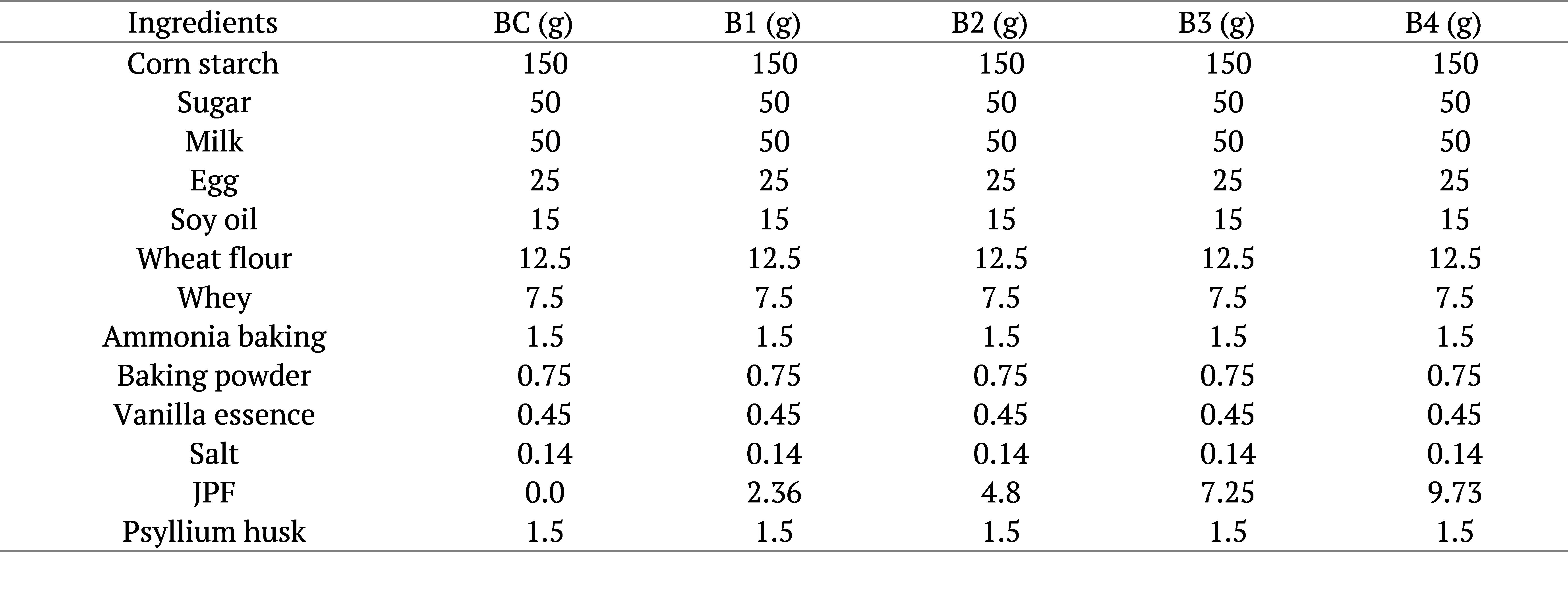The sequilho biscuit is very appreciated by Brazilian consumers and is elaborated with corn starch as the main ingredient, followed by vegetable shortening, eggs, and sugar. The use of wheat flour is optional, and this formulation results in a biscuit with specific characteristics like very aerated, with high luminosity, white, and brittle. The addition of JPF in the sequilho formulation could improve its nutritional quality but, also, it could negatively modify its technological and sensorial characteristics.