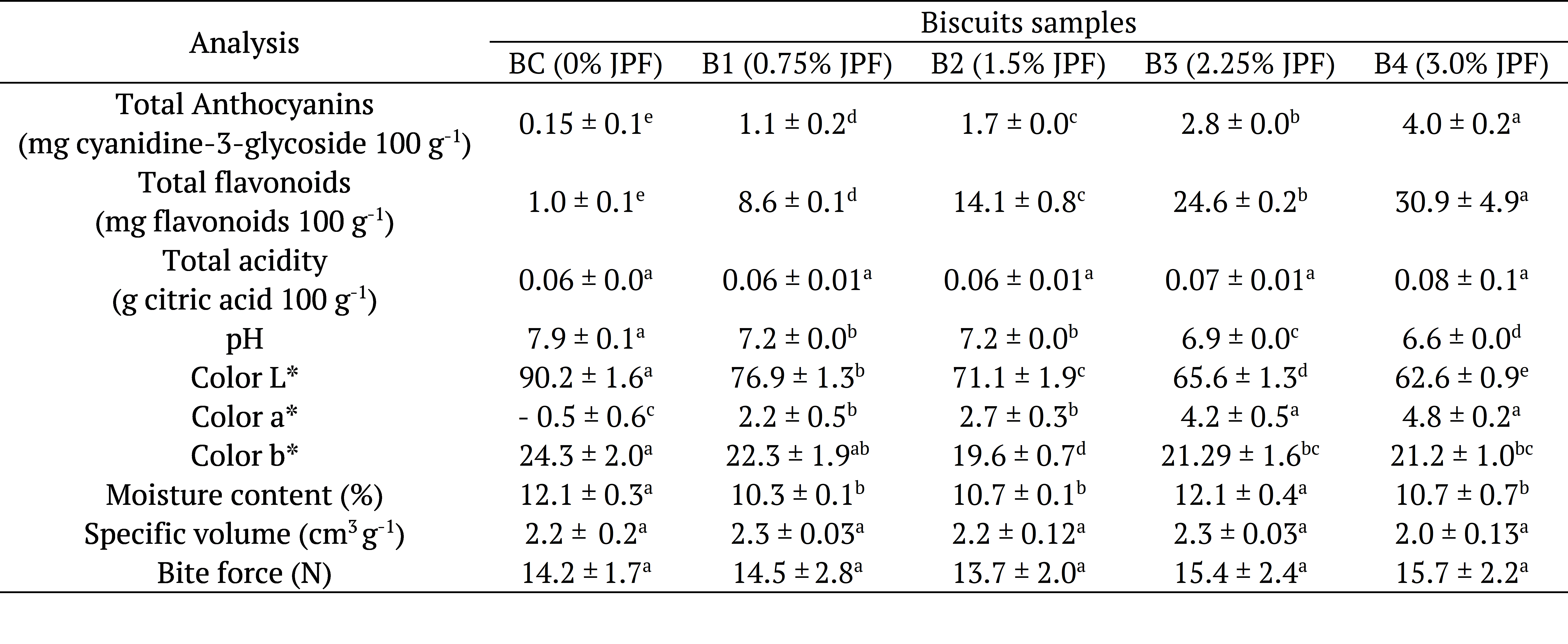 The values of a* increased with the addition of JPF, with a tendency to red, which is probably due to the high anthocyanin levels in the flour. The values of b* showed no relevant differences. Results obtained from the physicochemical analysis of biscuits are shown in Table 2.
