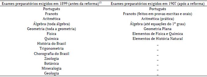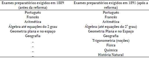 Em sua obra intitulada Apontamentos históricos do sesquicentenário da Escola de Farmácia de Ouro Preto, José Ramos Dias (1989) menciona que a instituição foi remodelada pelo Decreto n. 534, de 10 de julho de 1891, e entre as mudanças ocasionadas por essa norma estaria a implantação de novos exames preparatórios (trigonometria, física, química e história natural) para o ingresso de seus discentes. Embora o ideário positivista/enciclopédico inerente à Reforma Benjamin Constant não tivesse atingido de forma ampla os resultados previstos e algumas ideias não saíram do papel, observa-se que após a reforma conteúdos científicos foram acrescentados aos exames preparatórios exigidos para o ingresso na Escola de Farmácia de Ouro Preto. Conforme se pode constatar na Tabela 2 comparativa abaixo: