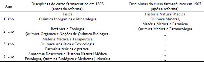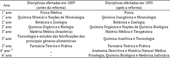 Com o objetivo de acompanhar as consequências que estas reformas tiveram na instituição e as reações da classe farmacêutica diante este cenário, cabe destacar que no final do período monárquico, os exames necessários para a matrícula na Escola de Farmácia de Ouro Preto de acordo com Dias (1989) eram: Português, Francês, Aritmética, Latim, Álgebra (até equação do segundo grau), Geometria Plana e no espaço e Geografia. Por sua vez, o curso farmacêutico desta instituição era composto por sete cadeiras. Ver Tabela 1 a seguir: