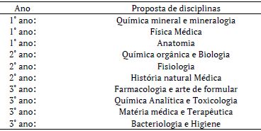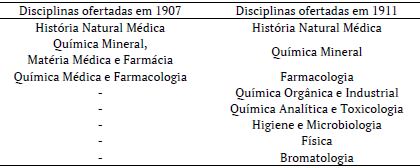 No tocante aos estudos iniciaes para a matricula nos cursos pharmacologicos, o citado Código do ensino reduziu os preparatórios [...]. Não parou por ahi, foi além: reduziu o curso que era de três annos, a dous, supprimindo as cadeiras de physica medica, de chimica analytica e toxicologia e fundindo outras em uma única. (Ouro Preto, 1907).