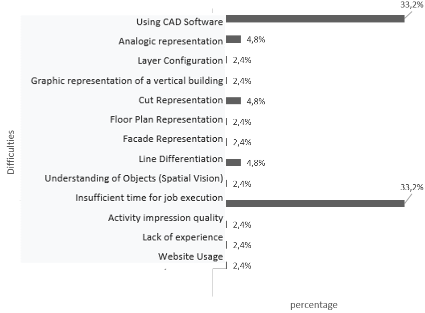 For the group of Civil Engineering students, the operational difficulties together summed up 40.4%. In addition to the difficulty in using CAD ‘software’ (33.2%), students reported difficulties with analogical graphing (4.8%) and configuring CAD layers (2.4%).