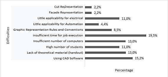 From Figure 4 it is possible to ascertain the main difficulties identified by the students of Electrical Engineering and Control and Automation Engineering. The first aspect that stands out is the distribution of the difficulties found when compared with Graph 1, since they are less concentrated. Even so, the two major difficulties are the same as those of the first group: use of CAD ‘software’ (15.2%) and insufficient time (19.5%). However, they had lower rates.