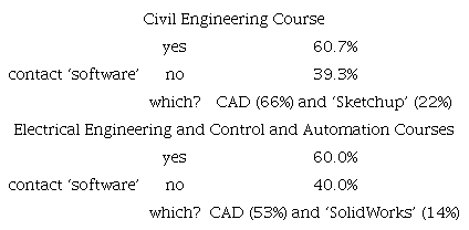 It was found that in both groups there is a significant number (Table 3) of student s with previous knowledge in the use of computer graphics ‘software’, with CAD being the most used in both. It is possible that some have learned in previous subjects or in complementary courses, such data has not been verified. It is known that some Civil Engineering classes, when studying Descriptive Geometry, use CAD ‘software’ for the development of some activities, but it is an approach adopted by some teachers. Second is ‘Sketchup’ with 22% for the Civil Engineering class and ‘SolidWorks’ for the Electrical and Automation Engineering class. Both ‘software’ is also CAD technology but work with three-dimensional object modelling. Such data show a market trend, because while ‘Sketchup’ is most widely used in construction, ‘SolidWorks’ is most commonly used in the mechanical industry. Although not investigated in the questionnaires, it is possible to suggest that students seek to learn the ‘software’ most used by the job market.