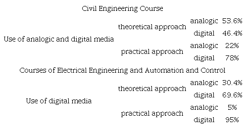 It was found that the perception of the groups, considering the course, it is quite dissonant about the preference according to approach (Table 4). Civil Engineering students exposed to both media throughout the course had a greater preference for analogic media for theoretical explanations and digital media for practical exercises. The students of Electrical Engineering and Control and Automation exposed only to digital media, (expressively) preferred digital media for both theoretical and digital approach. In this case, how can they compare with a medium to which they were not exposed? However, they have prior experience with another discipline of graphic geometry that is worked exclusively on analogic media. It is noteworthy that in the theoretical approach it is instinctive of the teacher to use the framework to explain some specific content. Thus, it is possible to say that the students were able to compare, in the theoretical approach, analogic and digital media.