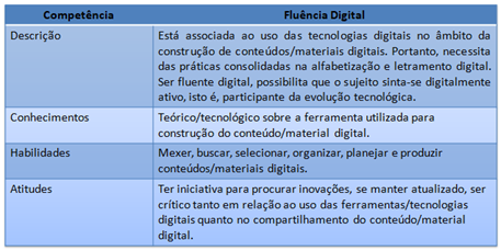 3. Fluência digital: está relacionada ao uso das TD no âmbito do sujeito sentir-se digitalmente ativo/participante da evolução tecnológica. Ademais, ser fluente possibilita a construção de conteúdos/materiais digitais. Portanto, está intimamente relacionada tanto com o conceito de alfabetização como com o de letramento digital. O sujeito será fluente digital somente se for além do ato de saber buscar um texto, ler, escrever, salvar e enviar um documento por meio de tecnologias digitais, ou seja, se for crítico em relação ao uso das TD de forma a combinar o uso de diferentes ferramentas digitais (Machado et al., 2016).