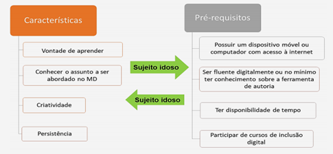 Nessa perspectiva, foi possível identificar, como pré-requisito para a construção de conteúdos digitais, a necessidade de o idoso ser fluente digitalmente ou, no mínimo, dominar conhecimentos tecnológicos básicos sobre a ferramenta de autoria utilizada nesta elaboração, conforme aponta a Figura 3. Este perfil foi mapeado com base nos apontamentos realizados pelos sujeitos da pesquisa.