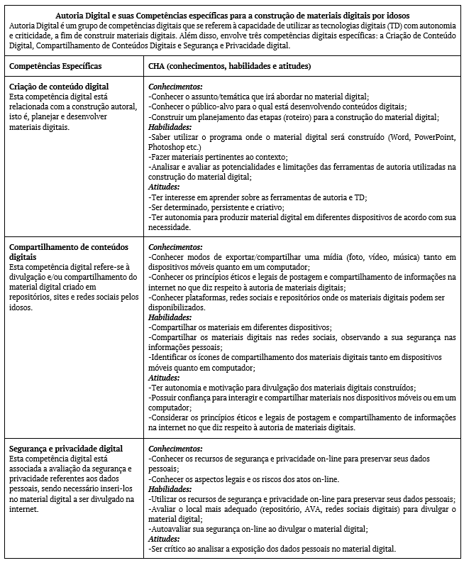 RESUMO: O presente artigo objetiva investigar as competências digitais necessárias para a criação de materiais digitais por idosos e suas potencialidades para a melhoria da qualidade de vida. No contexto atual, observa-se, além das mudanças tecnológicas, o interesse de alguns idosos em aprender a construir materiais digitais. A metodologia utilizada nesta pesquisa foi a qualitativa, de campo, com abordagem interpretativa. O público-alvo foram idosos com média de idade de 72,4 anos que participam de um curso de inclusão digital em uma Universidade e especialistas com média de idade de 36,8 anos de idade. No que se refere à coleta de dados, foram aplicados dois tipos de instrumentos: questionários on-line e observação participante. Portanto, foi possível mapear uma competência geral denominada Autoria digital e três específicas: Criação de conteúdo digital; Compartilhamento de conteúdos digitais e, por último, Segurança e privacidade digital. Assim, essa pesquisa identificou como pré-requisito para a construção de conteúdos digitais a necessidade de o idoso ser fluente digitalmente ou, no mínimo, dominar conhecimentos tecnológicos básicos sobre a ferramenta de autoria utilizada.