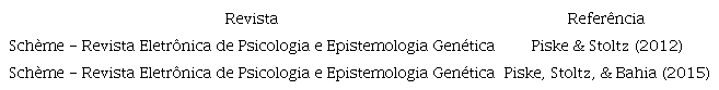 Em função do número reduzido de pesquisas localizadas optou-se pela busca junto a revista Schème - Revista Eletrônica de Psicologia e Epistemologia Genéticas que concentra estudos relativos a pesquisas com fundamentação teórica relacionada a obra de Piaget. A Tabela 2 demonstra que neste periódico foram encontrados dois estudos.