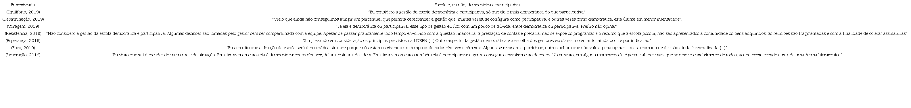 Os entrevistados foram questionados sobre a organização das escolas em que atuavam, levando em consideração o contexto da gestão democrática. Na Tabela 2, a seguir, apresentamos uma síntese das declarações.