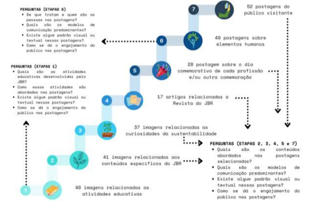 As imagens postadas pela equipe de comunicação do JBR foram selecionadas e captadas em sete momentos. No primeiro, realizou-se um mapeamento de caráter qualitativo do conteúdo (textual e imagético) das postagens do Instagram do JBR, no período de 24 de novembro de 2016 (data das primeiras postagens) a 15 de março de 2020, quando foram contabilizadas 766 postagens e 25.400 seguidores. Todas as etapas foram organizadas, juntamente com as respectivas descrições, curtidas, comentários e legendas, o que deu origem aos cadernos de imagens com as seguintes categorizações: i) atividades educativas; ii) conteúdos científicos; iii) sustentabilidade; iv) artigos da revista JBR; v) dia comemorativo de cada profissão e/ou outra comemoração; vi) elementos humanos; e vii) público visitante conforme a esquematização (Figura 1).