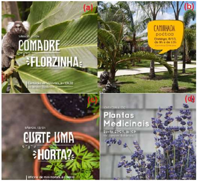 Considerando-se o critério de abordagem comunicacional, que possibilita inferir sobre como as atividades educativas são abordadas nas postagens do Instagram, o enfoque que predomina nas imagens é o promocional, que consiste em divulgar a atividade, sinalizando data e horário. Já as legendas têm uma perspectiva diversificada. Além do viés promocional, que já era esperado, observa-se o caráter de entretenimento. Desse modo, as atividades educativas de uma forma promocional e de entretenimento no Jardim Botânico do Recife vêm como forma de popularizar e valorizar o espaço, para despertar um olhar crítico acerca das questões ambientais de uma forma lúdica (Vendrasco, Cerati & Rabinovici, 2013). Não se observa a perspectiva de mobilização, quando há o convite à ação e ao engajamento em ações diversas. Na Figura 2, apresenta-se apenas uma pequena amostra do recorte.