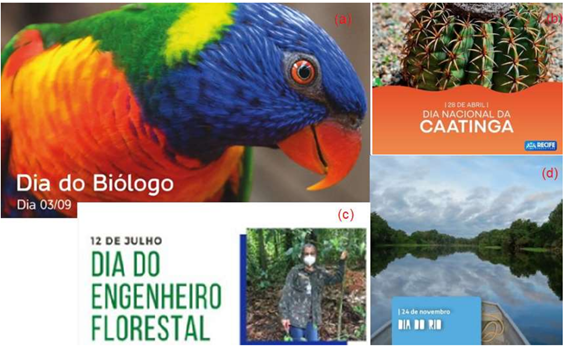 As postagens apresentadas abordaram diversas datas comemorativas, como, por exemplo, o Dia das Profissões, o Dia Internacional da Biodiversidade, o Dia do Rio, o Dia Nacional das Abelhas, o Dia do Mangue, o Dia de Proteção às Florestas, o Dia da Mata Atlântica, o Dia Internacional da Biodiversidade, o Dia Nacional da Caatinga e o Dia Internacional dos Direitos Humanos. Os resultados apresentados indicaram que a maior parte dos dias comemorativos versa, essencialmente, sobre biodiversidade, relações ecológicas, fatos históricos, consumo consciente e programação de eventos. Na Figura 6, destaca-se um pequeno recorte.