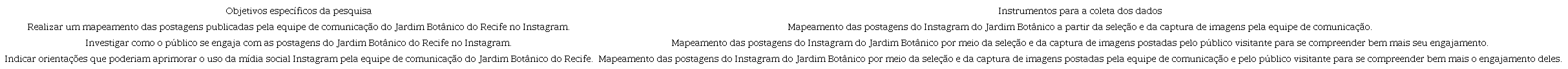De acordo com Oliveira (2011, p. 43, grifo da autora), “[…] para o levantamento de dados, é preciso selecionar instrumentais adequados que preencham os requisitos de ‘validez’, ‘confiabilidade’ e ‘precisão’”. Nessa perspectiva, a seleção e a captura de imagens devem ser os instrumentos mais adequados para coletar os dados. A Tabela 1 especifica os instrumentos utilizados em cada etapa da pesquisa. De acordo com os objetivos específicos desta pesquisa, aponta-se o caminho necessário para identificar as estratégias que a equipe de comunicação do Jardim Botânico utiliza em suas postagens e de que maneira o público se engaja.