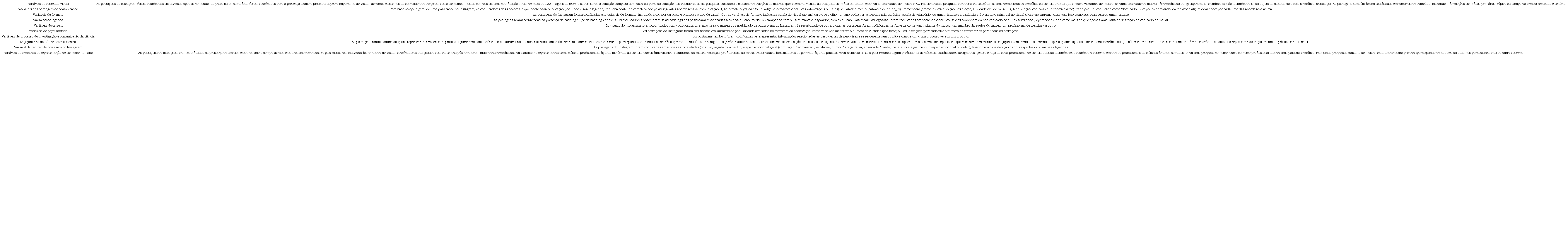 Com relação às variáveis de formato, considerou-se o layout das postagens e verificou-se se os visuais das imagens estavam relacionados à descrição da postagem e à divulgação das ciências. Como resultado, constatou-se uma credibilidade oriunda da confiança do público ao associar as postagens a um caráter científico, que não se restringe ao senso comum, mas ao meio acadêmico e demais áreas do conhecimento (Chalmers, 1993).