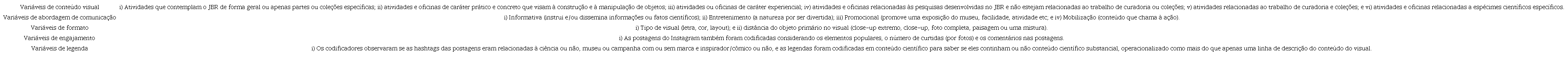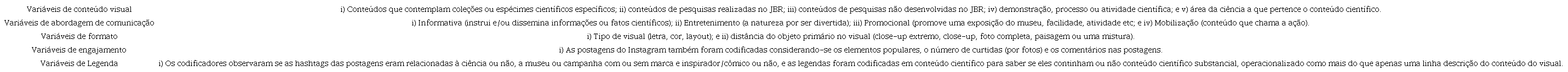 Inicialmente, foram consideradas as variáveis propostas por Jarreau et al. (2019) para analisar as imagens postadas no Instagram do JBR, embora eventualmente outras variáveis se façam necessárias. As Tabelas 3 e 4 explicitam as variáveis utilizadas nos mapeamentos realizados.