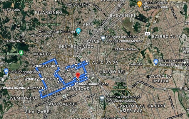 Pensando na ocupação desse espaço, tentamos traçar dois mapas buscando apreender as principais partes da cidade onde essas livrarias e sebos se encontram, tentando apreender pistas da circulação do público que as frequentava, como um roteiro possível de muitos encontros e desencontros. Ligando os pontos, e com a ajuda do Google Maps, traçamos o seguinte roteiro das livrarias em Curitiba, conforme Figura 1.