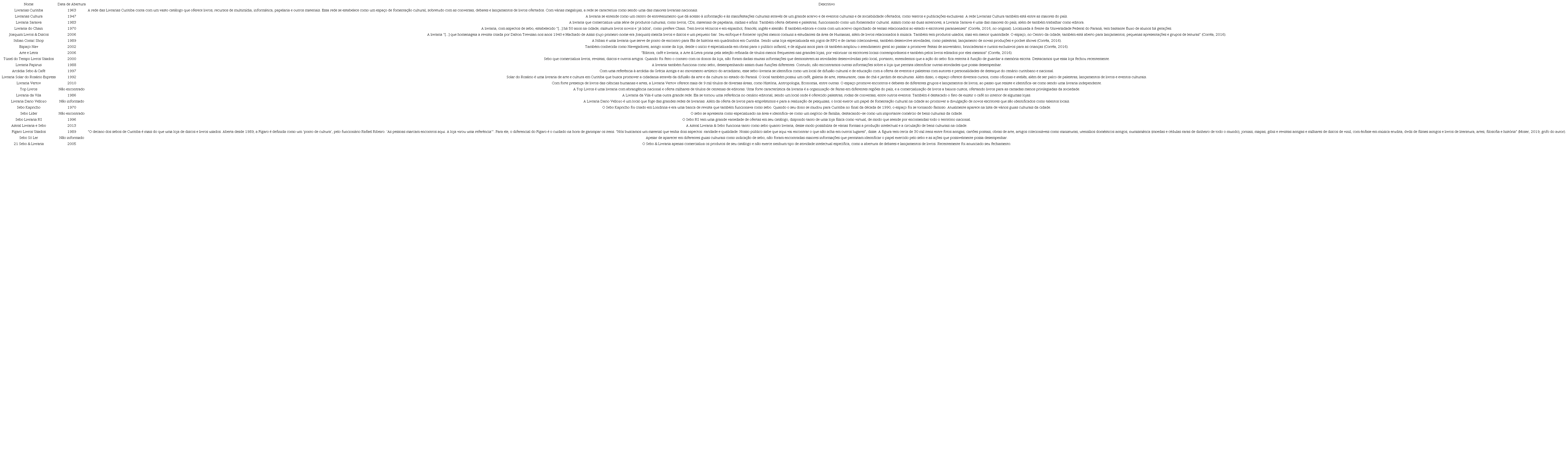 Com o mapeamento realizado, ao todo foram catalogados 23 estabelecimentos, sendo seis sebos, seis lojas que funcionam como sebos e livrarias, e onze livrarias, tendo sido produzido a Tabela 1 para facilitar a visualização e a catalogação de cada sebo e livraria ao ser apresentado um breve informativo sobre cada local. As informações sobre cada sebo ou livraria foram levantadas, em 2019, a partir de um contato direto com cada estabelecimento, ou através de matérias de guias culturais na internet em que são referenciadas. Desse modo, chegamos ao seguinte conjunto, conforme consta na Tabela 1.