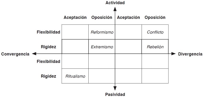 La tipología está construida a partir de cuatro variables, cada una de las cuales representa un continuum en el que se destacan polos opuestos típico-ideales. En primer lugar, la convergencia o divergencia entre los significados subjetivamente vividos por los actores, y los significados objetivados en las estructuras institucionales, normativas y de poder dominantes en un contexto. Los polos opuestos, puramente formales puesto que no pueden darse en ninguna realidad concreta, son los de la absoluta convergencia (actores cuyos significados vivenciados están por completo absorbidos en los objetivados) y la absoluta divergencia. La segunda variable es la actividad-pasividad de los actores, referida a la postura que asumen frente a un orden social determinado. La “actividad” consiste en la acción consciente y voluntariamente orientada en referencia a ese orden (sea en el sentido de aceptación o de oposición), y la “pasividad” en la ausencia de voluntad y conciencia (tal como se manifiesta, por ejemplo, en el malestar sintomático frente a un estado de cosas, que sin embargo el actor no enfrenta abierta y conscientemente). La tercera variable es justamente la de aceptación-oposición respecto de un orden socioinstitucional de referencia. Y la cuarta, la rigidez o flexibilidad del sistema considerado: se entienden como rígidos aquellos sistemas que presentan un alto grado de absolutización de los significados codificados, y como flexibles aquellos que tienen un alto grado de relativización de esos sentidos.