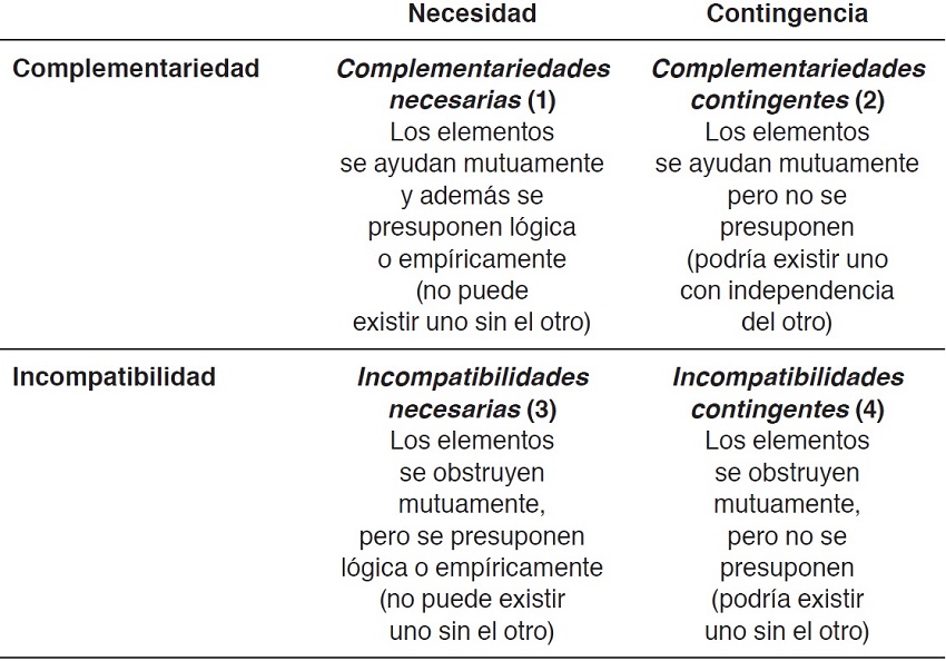 El caso de las incompatibilidades contingentes (4) es el más abierto de los cuatro, pues se trata de una contradicción en donde la convivencia no es necesaria (contingencia). Puede observarse, por ejemplo, en una institución que ve obstruidos su funcionamiento o sus intereses por otra cuya inexistencia no afectaría a la primera. Se trata del más inestable y del más indeterminado de los escenarios: lo primero (inestabilidad), porque la incompatibilidad sin necesidad promueve el movimiento, y lo segundo (indeterminación), porque la dirección del movimiento está abierta. En otras palabras, puesto que las instituciones se obstruyen hay incentivos para cambiar, y dado que no existe necesidad de permanencia se produce una apertura respecto de los cambios concebibles. La lucha de clases en el sentido de Marx es una ilustración de este escenario, lo mismo que la competencia mercantil entre empresas o las relaciones de poder de suma cero.