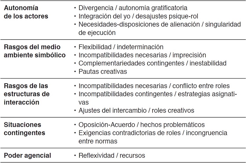 Hay, proponemos en concreto, al menos cinco ejes en los que pueden agruparse las variables que se relacionan positivamente acerca del tema de la creatividad de la acción social: (i) un grupo referido a la “autonomía” de los actores respecto de los marcos socioinstitucionales en que actúan; (ii) uno que tiene que ver con la naturaleza de su medio ambiente simbólico; (iii) uno más conectado con las estructuras institucionalizadas de interacción en que participan; (iv) otro vinculado a las situaciones contingentes que enfrentan en esos marcos; (v) y un eje enlazado globalmente a su poder agencial.