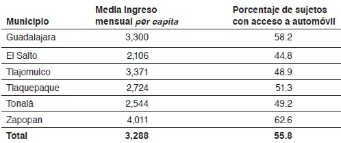 Ante estas circunstancias se hace especialmente importante estudiar los distintos tipos de uso de los medios de transporte de los municipios no centrales (Tlaquepaque, Tonalá, Tlajomulco y El Salto) de la metrópoli. En estas alcaldías (con la excepción de Tlajomulco, que alberga un conjunto de fraccionamientos de clase alta), los ingresos mensuales son considerablemente inferiores respecto de los que se disfrutan en Zapopan y Guadalajara y existe una menor disposición del automóvil.