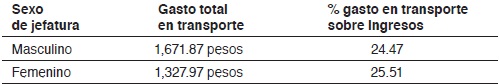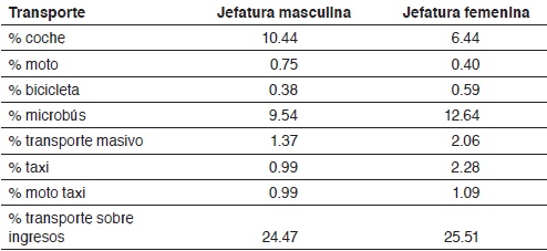 Aparte de considerar el género de la jefatura, el ingreso ha sido consignado como una de las variables más importantes en la determinación de los usos diferenciales de los distintos medios de transporte. En el estudio realizado se han encontrado diferencias de medias de gasto importantes que han resultado ser significativas estadísticamente:
