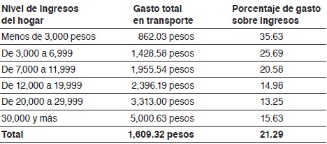 Como es obvio, conforme aumenta el nivel de ingresos del hogar incrementa también el gasto absoluto en transporte y, en consecuencia, los hogares con mayores rentas tienen más facilidades para trasladarse y aprovechar las oportunidades que les ofrece la ciudad. Sin embargo, cuando analizamos el gasto en términos relativos según el volumen de entradas, se puede trazar una línea descendente en la proporción de pagos destinados al transporte según aumenta el nivel de retribuciones. Sobre quienes más pesa el gasto del transporte son los hogares con recursos de menos de tres mil pesos mensuales, que deben destinar a este rubro más del 35 por ciento del total.