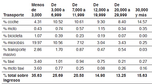 La tendencia que se puede apreciar está en consonancia con otros hallazgos ya revisados. Conforme crece el nivel de renta de los hogares, disminuye el porcentaje del gasto destinado al transporte público colectivo (sobre todo el microbús) y no colectivo (con partidas importantes en el grupo de menores ingresos destinadas a taxis y a moto taxis). Esto es debido a que los grupos con mayores recursos acceden al automóvil y pasan a invertir proporcionalmente más dinero en la operación cotidiana de este medio de transporte, con las ventajas que este hecho trae consigo en un entorno urbano disperso y con una escasa y descoordinada provisión de servicios de transporte público.