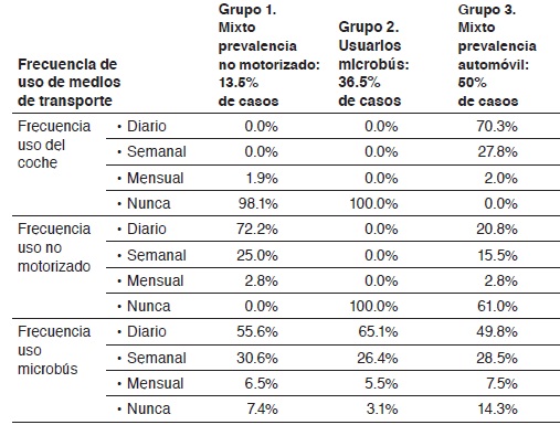En primer lugar, se intentó agrupar a los encuestados según la frecuencia del uso que realizaban de los principales medios de transporte a través de un análisis de conglomerados. Dada la escasa implantación del transporte masivo en el AMG, se consideró la utilización de los microbuses, el automóvil y medios no motorizados como variables clasificadoras. Se obtuvieron tres grupos principales de usuarios (véase Cuadro 2).