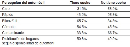 De las personas que opinan que el coche es eficaz, más del 65 por ciento se ubican en hogares con automóvil, frente a sólo el 34.3 por ciento que se encuentran en familias sin vehículos motorizados. Otro valor positivo, como la comodidad que ofrece, también se reparte desigualmente, según se tenga o no coche en el hogar. Casi el 55 por ciento que sostiene esa opinión se encuentra en familias que disponen de al menos uno, mientras que sólo el 45 por ciento se hallaría en hogares sin ellos. Finalmente, quienes sostienen valores negativos se sitúan preferentemente en entornos donde no se posee este tipo de vehículo. Así sucede con quienes piensan que es caro (el 68.5 por ciento vive en hogares sin coche) y con quienes afirman que es contaminante (el 66.7 por ciento carecen de vehículos en su hábitat cercano).