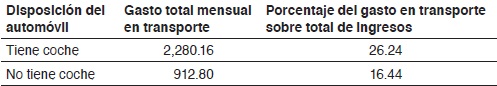 Al analizar los datos se hace evidente que tienden a establecerse dos grupos principales de consumidores de transporte. Por un lado, aquellos que disponen de automóvil e invierten una gran cantidad de recursos en su movilidad y aquellos que no y restringen sus desplazamientos. Así se expresa, por ejemplo, si examinamos los resultados del Cuadro 4 sobre el gasto en transporte.