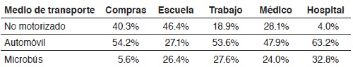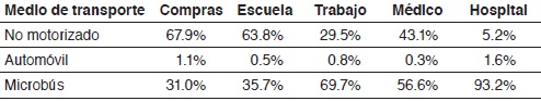 Puesto que estamos hablando de hogares que en términos generales cuentan con recursos modestos, aquellos que disponen de automóvil no realizan un uso indiscriminado del mismo, sino que lo racionan e implementan claras estrategias según el tipo de actividad a realizar. Así, se hace patente que nada más se utiliza de una forma secundaria para acudir a la escuela y sólo es ligeramente preponderante tanto para realizar las compras como para acudir al médico. Sin embargo, existen actividades que acaso se consideren lo suficientemente imperativas como para exigir su mayor empleo, como es el caso del trabajo (el 53.6 por ciento de los hogares que disponen de uno lo utilizan para acudir a esta actividad) y, sobre todo, para ir al hospital (el 63.2 por ciento acuden en él a este tipo de centros). Las familias que no disponen de automóvil, y que enfrentan la escasez del transporte masivo, se ven obligadas a instaurar estrategias más restringidas todavía, en una elección que oscila entre el microbús y las formas de transporte no motorizadas.