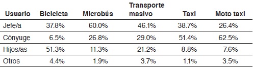 En primer lugar, es preciso enfocarse en cómo se distribuye la utilización de los distintos medios de transporte al interior de los hogares, bajo el supuesto de que sus diversos integrantes mantienen una serie de relaciones y de negociaciones que no necesariamente se dan en condiciones de igualdad. De este modo, para cada uno de los medios de transporte seleccionados en el grupo familiar existen usuarios preferenciales que ven condicionadas, de esta manera, sus posibilidades de movilidad.