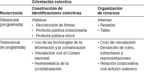 La “célula” del Conaci en la Ciudad de México inicia su andar el 22 de noviembre de 2014, con la presencia del recientemente nombrado “coordinador” de la capital en la cuarta reunión de la organización, que precisamente tiene lugar en esa ciudad y que también coincide con mi primera toma de contacto con el grupo a nivel local y nacional. Sin embargo, durante su primer año de existencia, pese a contar con “coordinador” no se conforma grupo alguno en términos sociológicos: se producen algunos encuentros y protestas, pero sin conseguir cohesionar un núcleo estable de participantes. La emergencia de la “célula”, a partir de noviembre de 2015, estuvo motivada por una campaña nacional de recolección de firmas que logra vincular a unos diez participantes. Tras la efervescencia de esta recolección el grupo se estanca, pero en julio de 2016 se reactiva con la entrada de un nuevo “coordinador” y otras tres personas, luego de mostrar su liderazgo en el apoyo a una huelga de hambre. El nuevo ciclo de actividad comprende la segunda mitad del año, que es cuando documenté formalmente las observaciones participantes. Sin embargo, el carácter autoritario de este líder local, sus diferencias con el dirigente nacional y su incapacidad para resolver conflictos internos desgastaron a la “célula” a lo largo de 2017, reduciendo tanto su número de integrantes (a sólo seis) como su participación en actividades. En el periodo observado, esta “célula” presenta once prácticas colectivas que pueden categorizarse en dos ejes: recurrencia y orientación (Tabla 1).