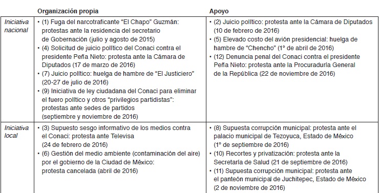 La protesta estacionaria deriva principalmente de dos fuentes: las iniciativas nacionales del Conaci y el emprendimiento político del líder local, el “coordinador” de la “célula”. La Tabla 2 presenta las protestas ejecutadas hasta 2016, con sus motivaciones y fechas. Las reparte en dos ejes: organización propia versus apoyo, e iniciativa nacional versus local.